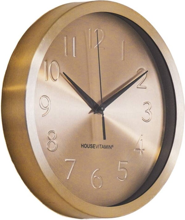 Tijd voor stijl! Deze gouden wandklok van Housevitamin is de perfecte mix van functionaliteit en design. Met een diameter van 25 cm en een elegante metallic afwerking past deze klok moeiteloos in een modern interieur. De opgelegde cijfers en slanke wijzers geven het geheel een luxe, minimalistische uitstraling.