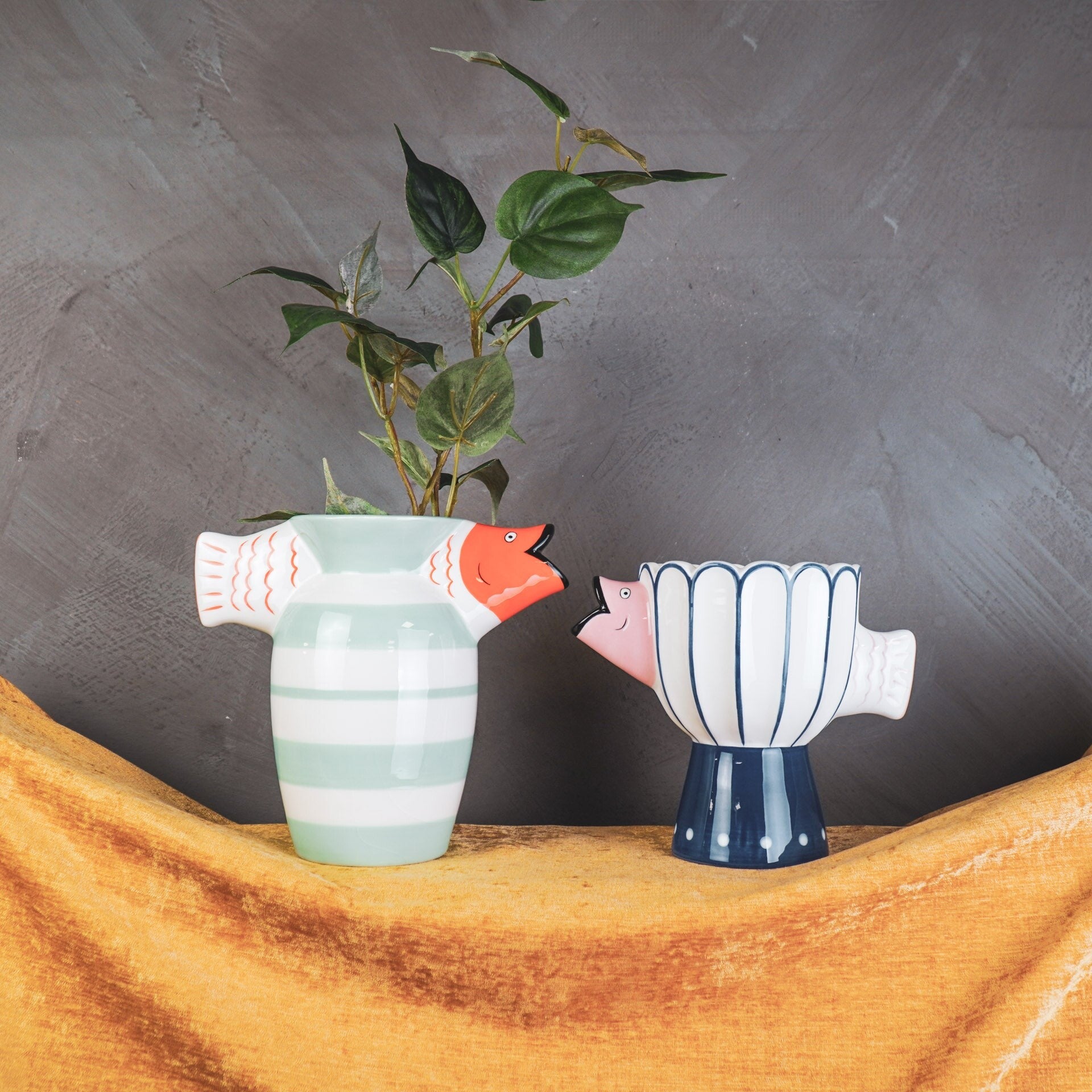 Op zoek naar een eyecatcher die humor én stijl in je interieur brengt? De Blush Fish van HouseVitamin is jouw nieuwe decor-held! Deze roze-blauwe vissenvaas steelt gegarandeerd de show met haar speelse vormen, frisse kleuren en luxe uitstraling.