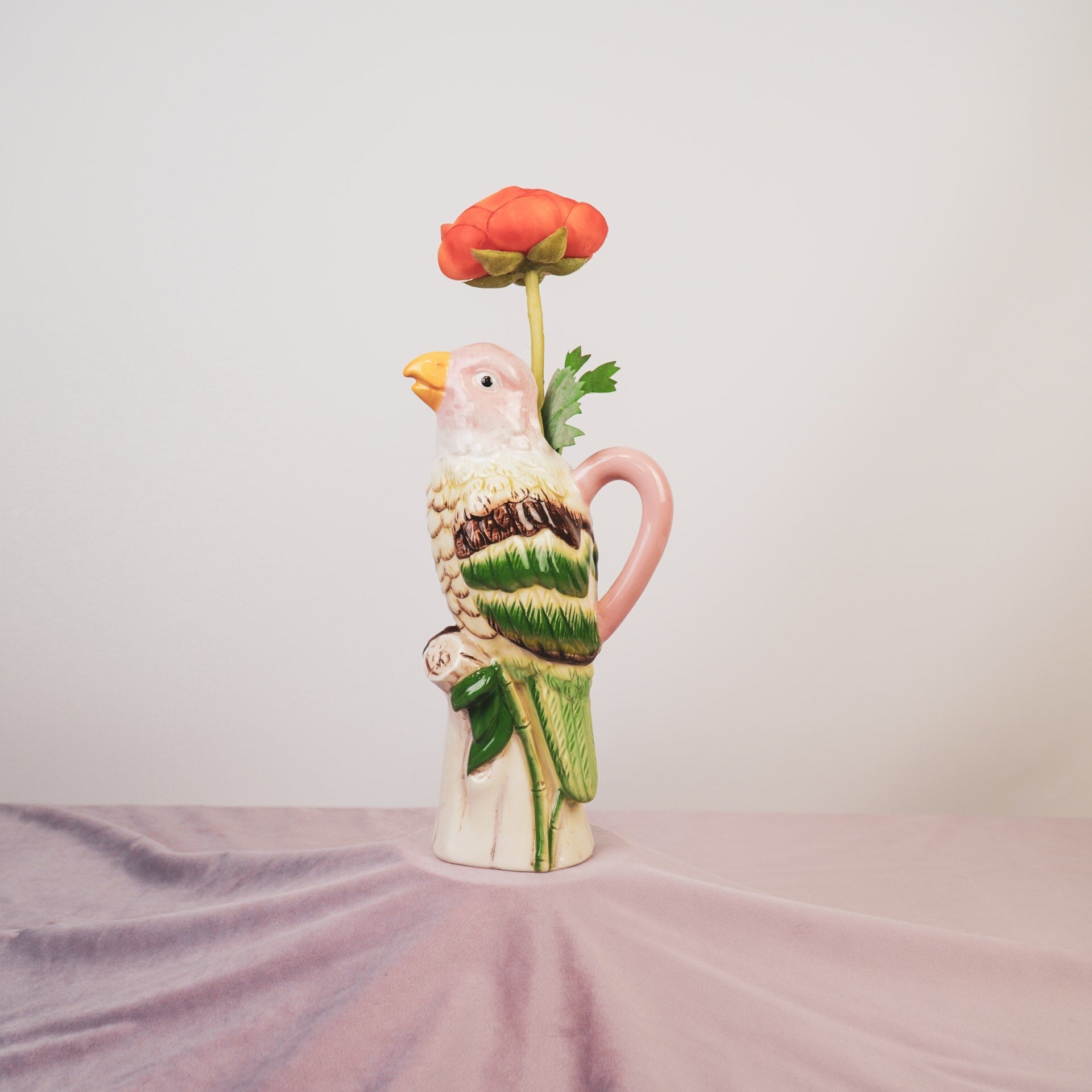 Breng een tropisch tintje in huis met deze opvallende papegaai kan van Housevitamin! Deze vrolijke kan is uitgevoerd in roze, groen en geel en vormt een unieke combinatie van functionaliteit en decoratie. Gebruik hem als bloemenvaas, waterkan of gewoon als eyecatcher in een open kast of op tafel.