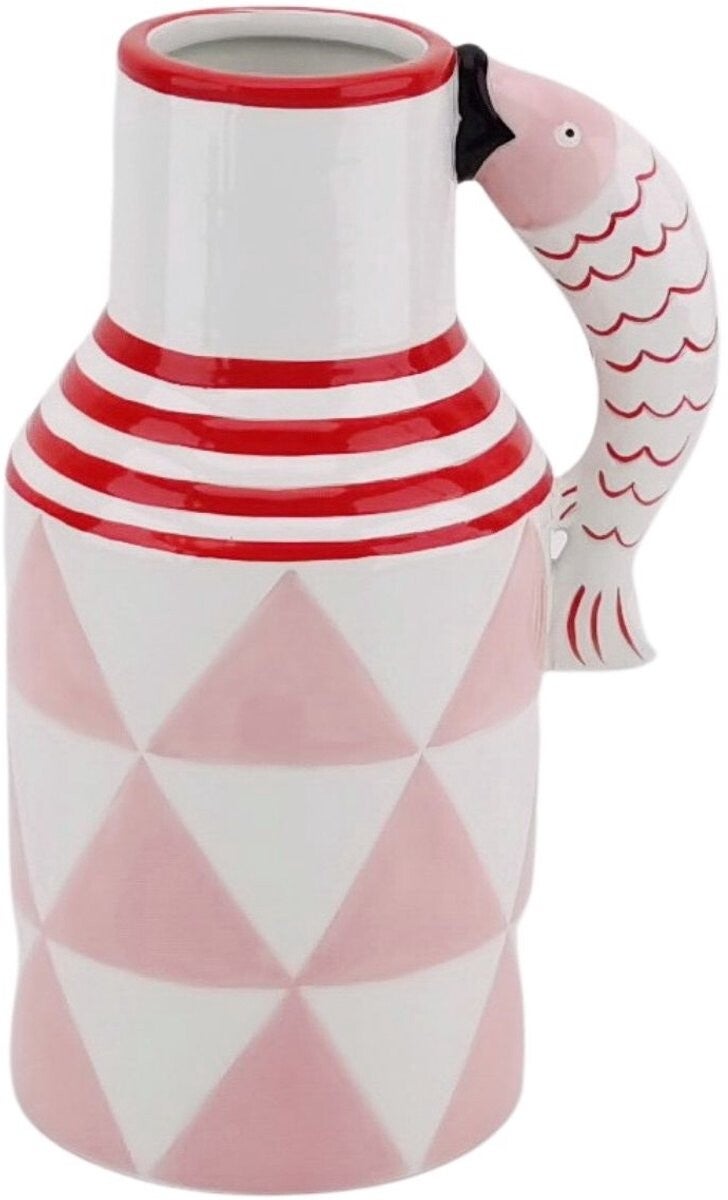 Zet een glimlach op tafel met deze opvallende viskan van HouseVitamin! De keramieken waterkan combineert speelse patronen met een unieke twist: het handvat is namelijk een vis! Met zijn geometrische driehoekdesign in zachtroze en de rood-witte strepen is deze kan een perfecte mix van retro en modern design.